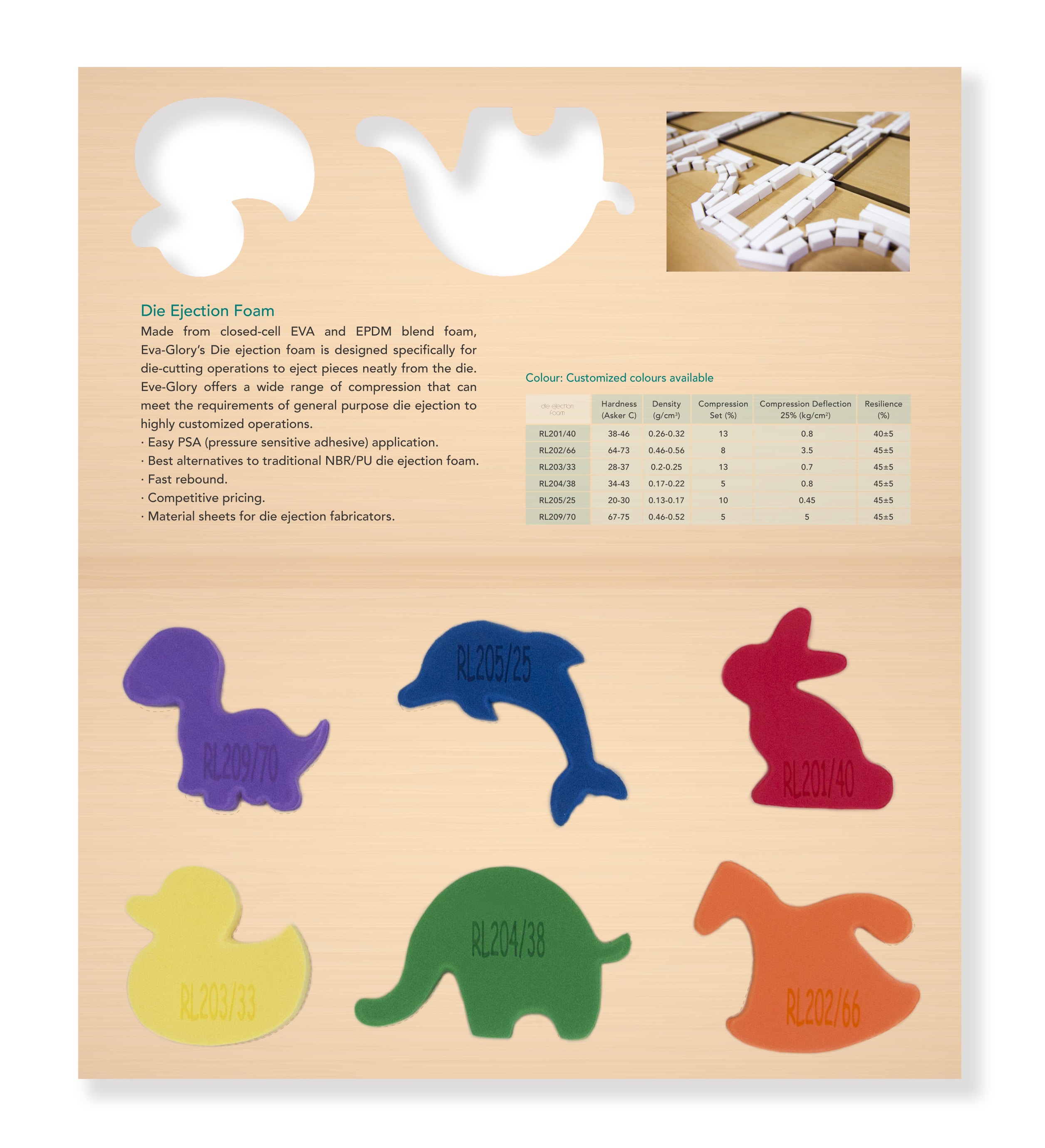 Combining the toughness and impact resistance of EVA with the heat, abrasion, and weather resistance of EPDM, we blend them to produce closed-cell foam which can further be customized for a wide range of compression sets and deflection to meet customers’ specific die cutting applications.
